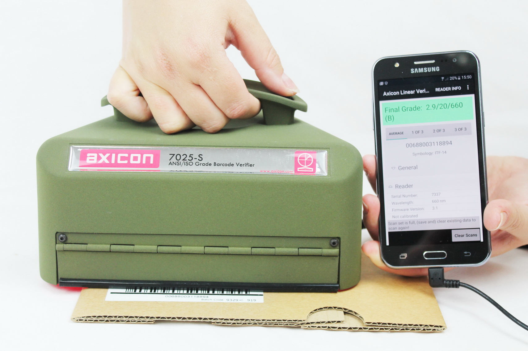 The Axicon linear barcode verifier app works with all 6000, 6500 and 7000 series verifiers that have USB connectivity. All you need is a short adapter cable that will allow the verifier’s USB cable to plug into the tablet’s microUSB or USB-C port, the one you use for charging.